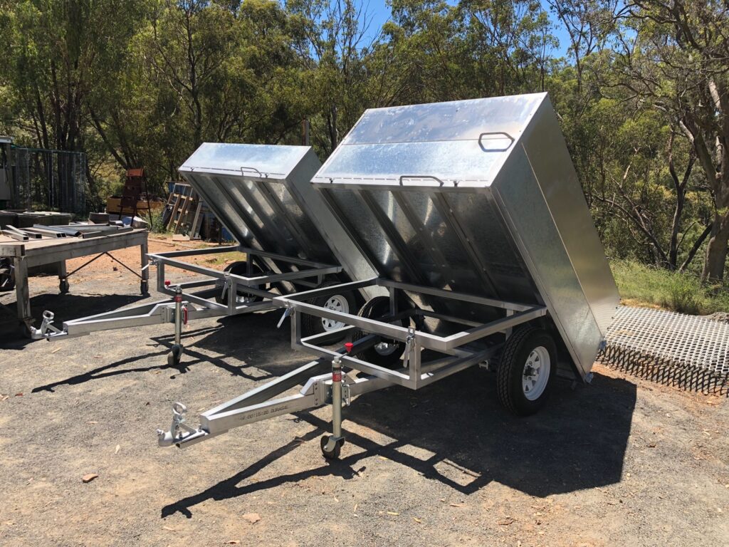 The standard two sizes are 1200 x 2000 or 1500 x 2000. They hold up to around 650Kg in the tray. I also custom make so the trailer will fit inside your stable doors. Even with a full load, the Tip Easy is easy to tow with a quad or side by ATV. If you cant reverse into the stable door way you can even push by hand into the stable and tip. This trailer is also a great allround tough trailer for general work on the farm.